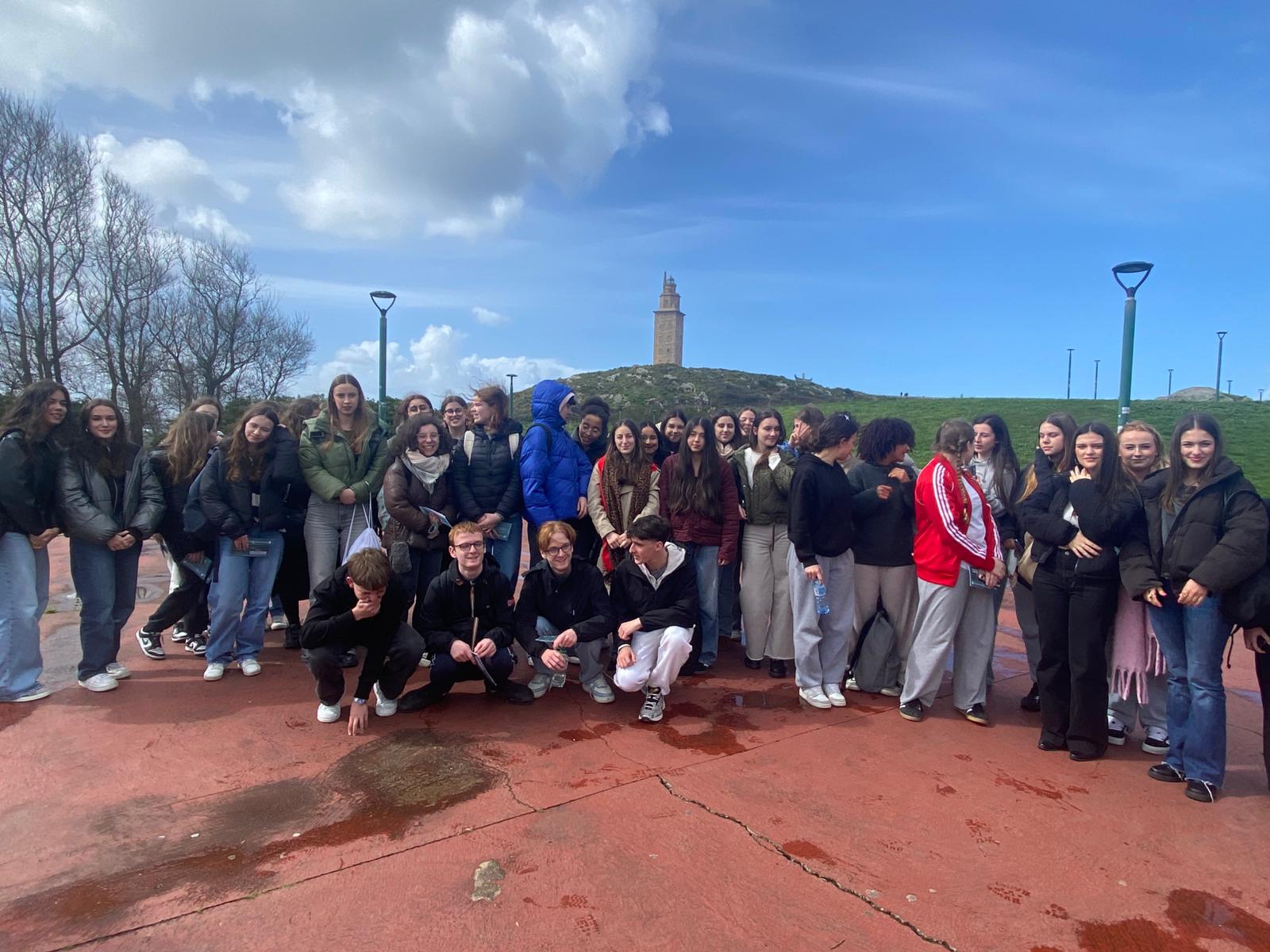 La semana de actividades en España ha comenzado. La primera visita cultural es a la ciudad de A Coruña. Y en A Coruña, la primera parada fue la Torre de Hércules, el más antiguo faro romano en funcionamiento. Los alumnos y profesores disfrutaron de las explicaciones por parte del personal de la torre y el cielo despejado les permitió según palabras de Jean-Manuel ”unas impresionantes vistas sobre el atlántico que cortaban la respiración , ¡lo mismo que subir las escaleras! 😀 Después de un breve recorrido por la Cidade Vella, nos dirigimos a la plaza más famosa para explicar la historia de María Pita, considerada la Juana de Arco de Galicia que salvó la ciudad durante las batallas contra los ingleses.